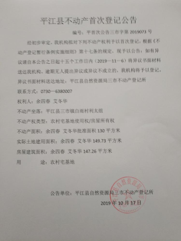 余四春 艾冬华平江县不动产首次登记公告