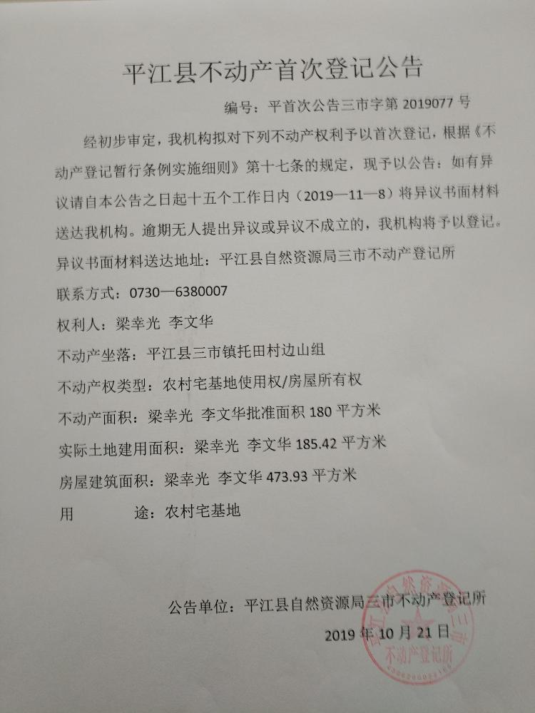 梁幸光 李文华平江县不动产首次登记公告