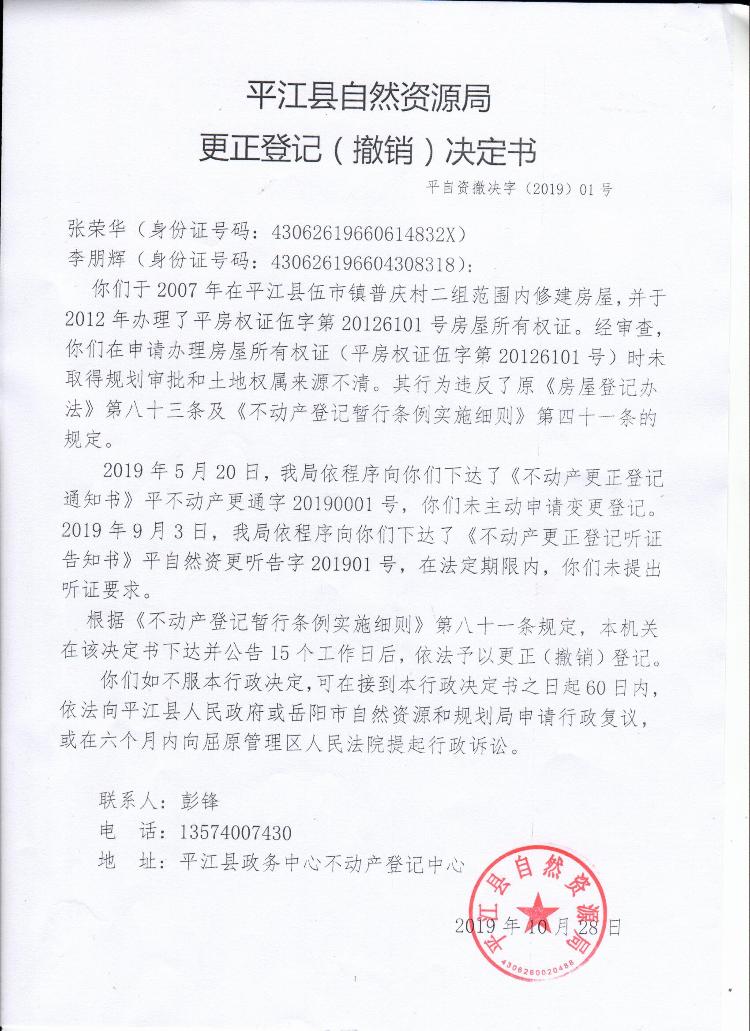 张荣华 李朋辉不动产更正登记(撤销)决定书