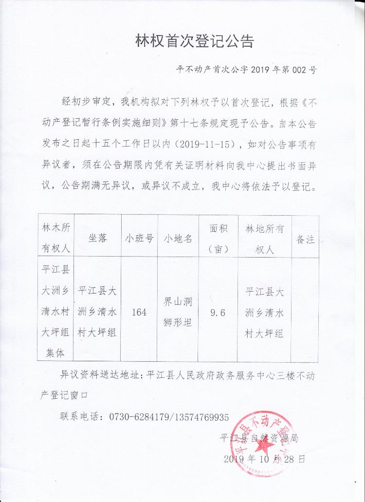 平江县大洲乡清水村大坪组集体林权首次登记公告