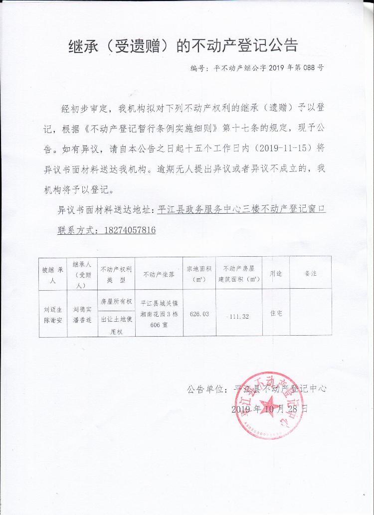 刘德宾 潘香连继承(受遗赠)的不动产登记公告2019088