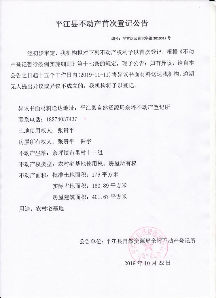 张贵平、钟宇不动产首次登记公告
