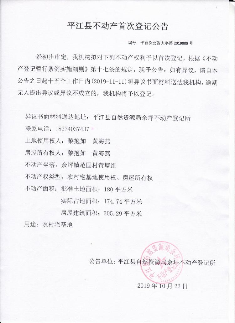 黎抱如、黄海燕不动产首次登记公告