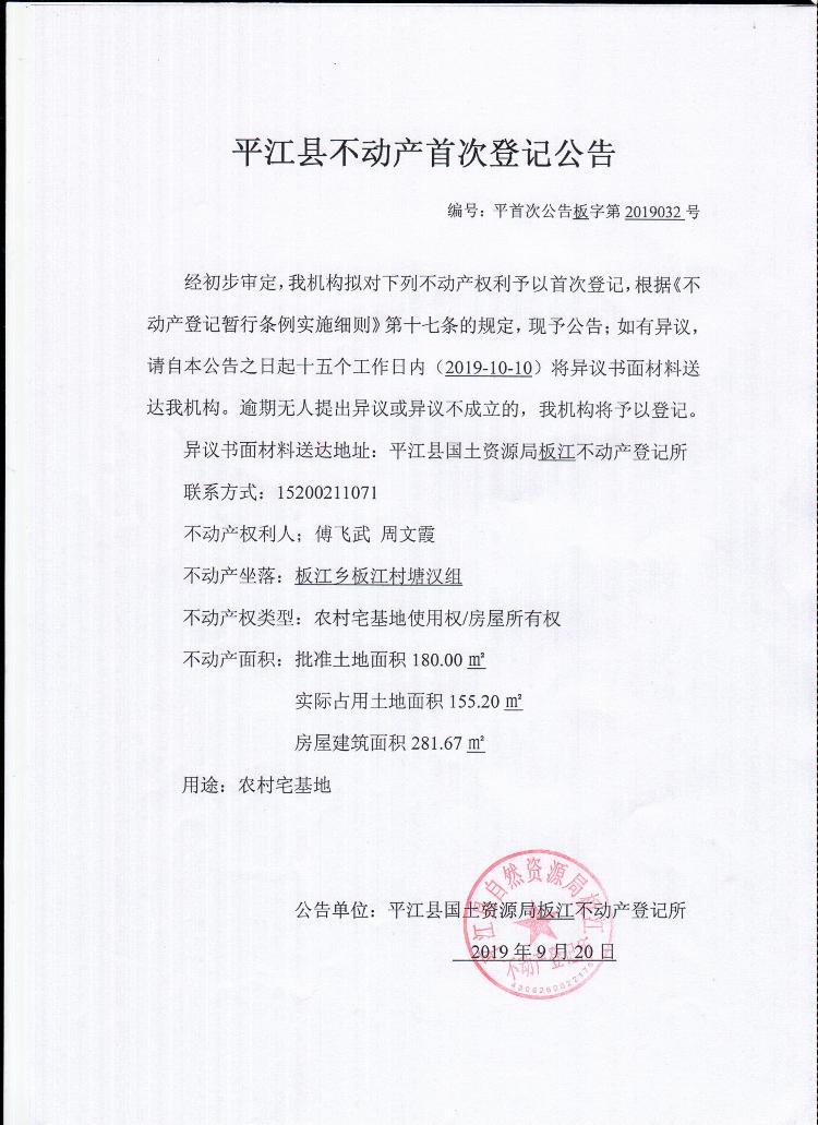 平江县不动产首次登记公告板字第2019032号