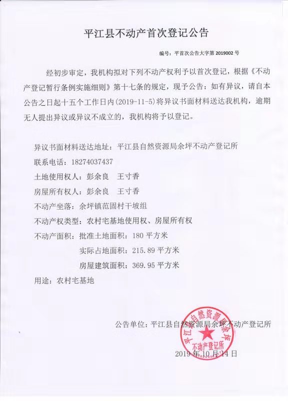 彭余良 王寸香平江县不动产首次登记公告