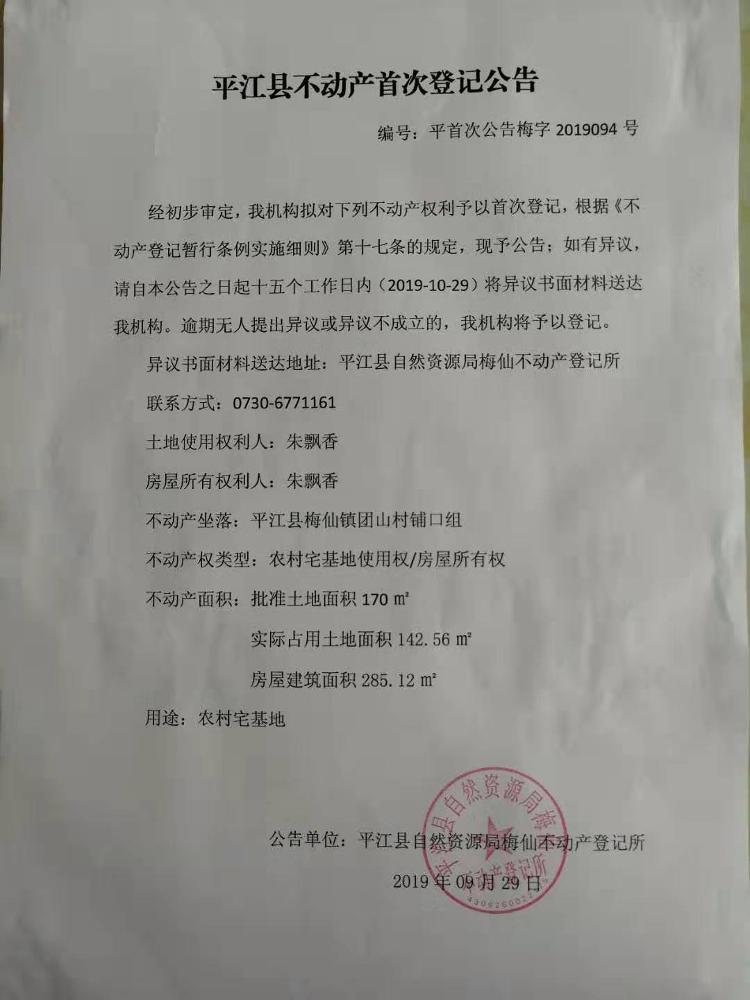 朱飘香首次不动产登记公告