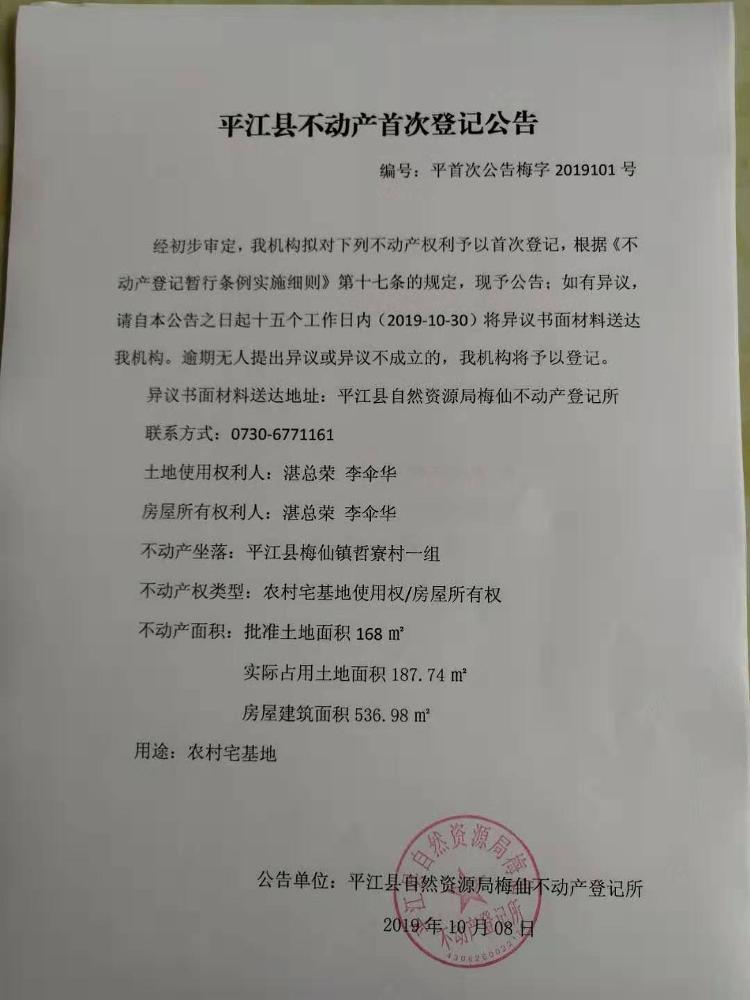 湛总荣 李伞华首次不动产登记公告