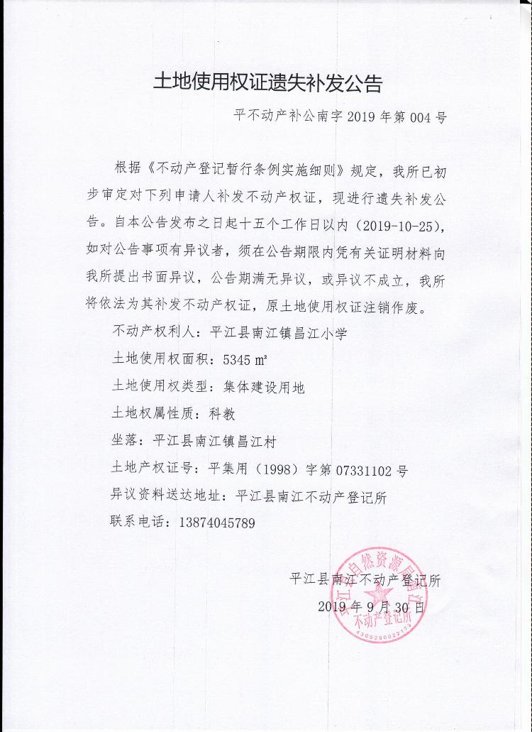 平江县南江镇昌江小学土地使用权证遗失补发公告