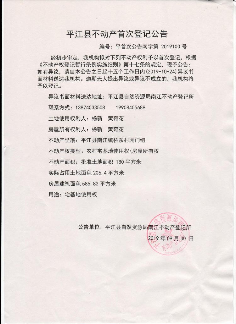 杨新 黄奇花平江县不动产首次登记公告