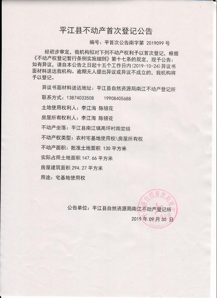 李江海 陈银花平江县不动产首次登记公告