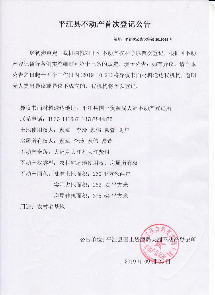 顾斌李玲顾伟易萱平江县不动产首次登记公告
