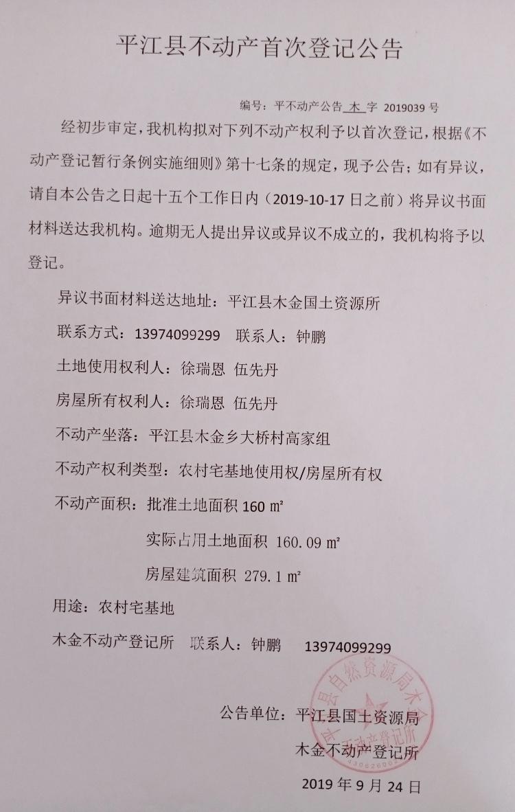 徐瑞恩 伍先丹平江县不动产首次登记公告