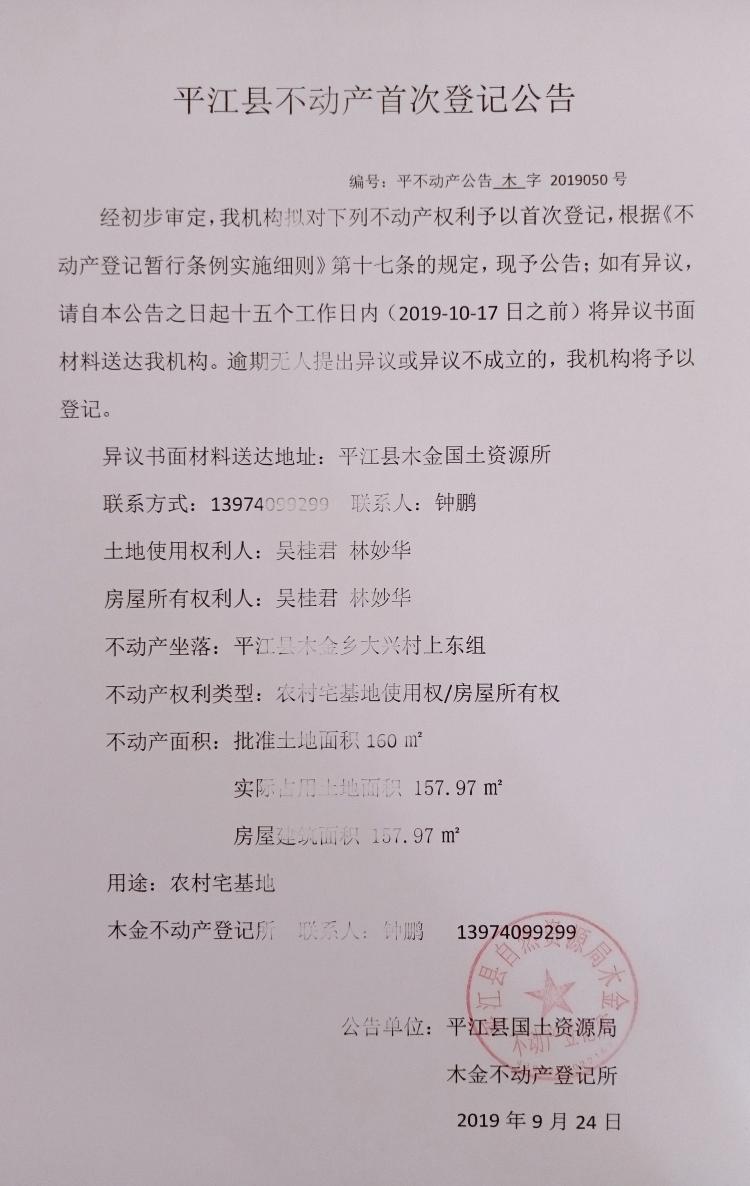 吴桂君 林妙华平江县不动产首次登记公告