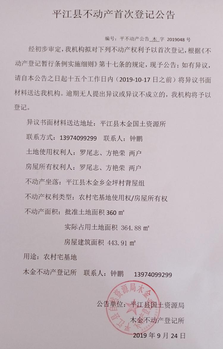 罗尾志 方艳荣 两户平江县不动产首次登记公告