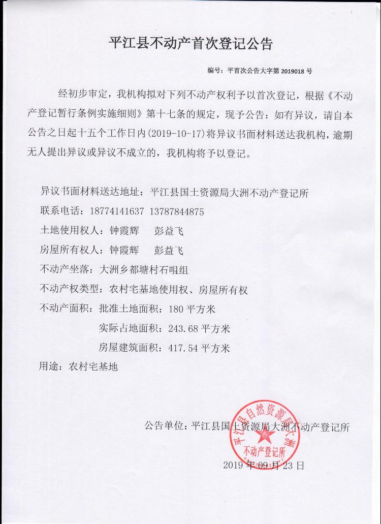 钟霞辉 彭益飞平江县不动产首次登记公告