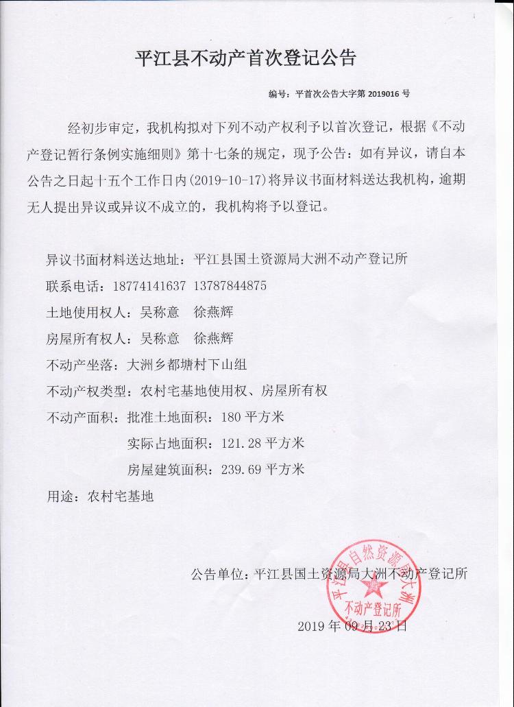 吴称意 徐燕辉平江县不动产首次登记公告.jpeg