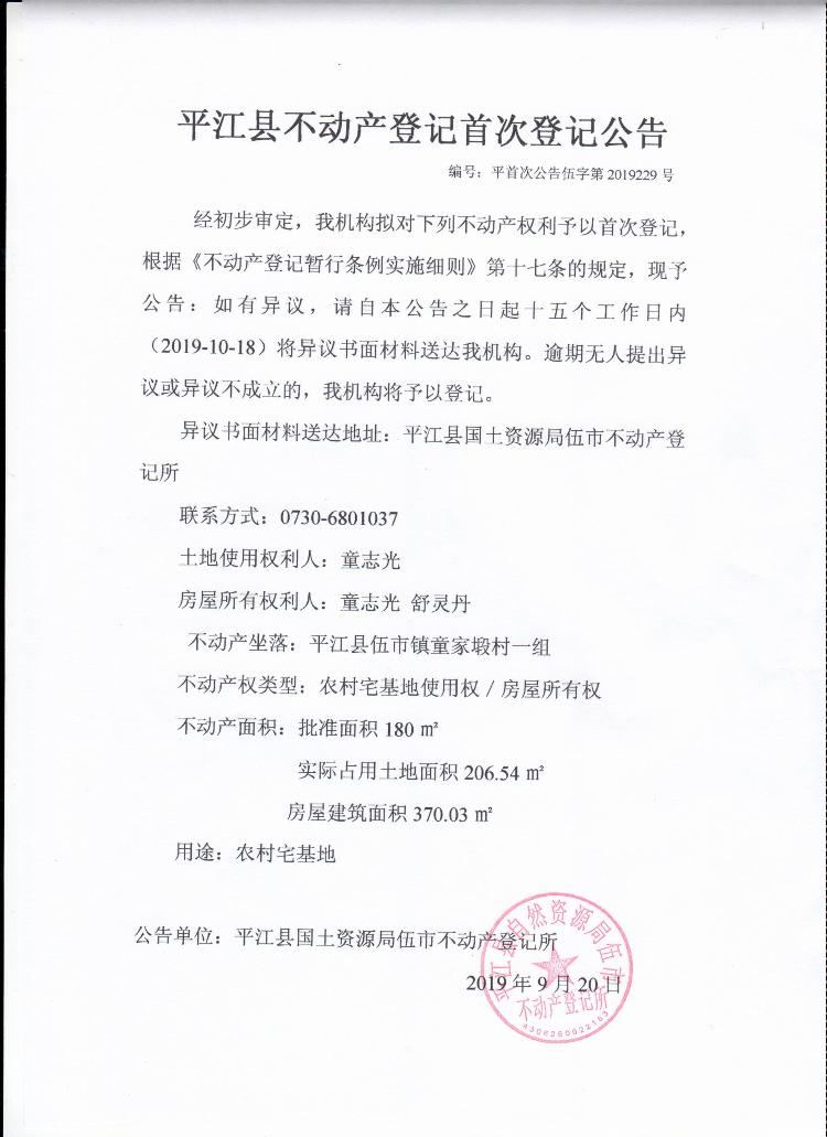 童志光 舒灵丹 平江县不动产首次登记公告 伍字第2019229号