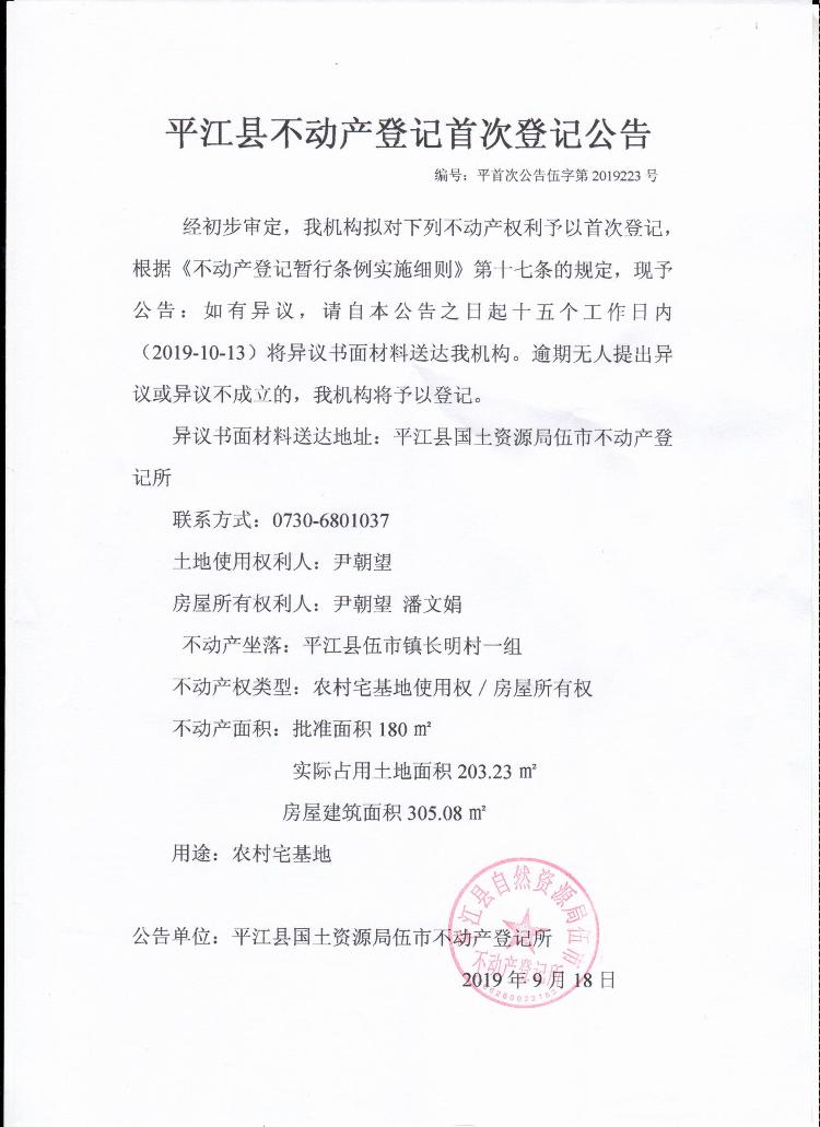 尹朝望 潘文娟 平江县不动产首次登记公告 伍字第2019223号