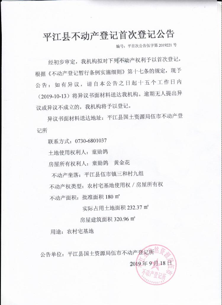 童勋鸽 黄金花 平江县不动产首次登记公告 伍字第2019221号