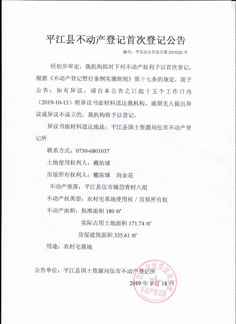 戴佑球 向金花 平江县不动产首次登记公告 伍字第2019220号