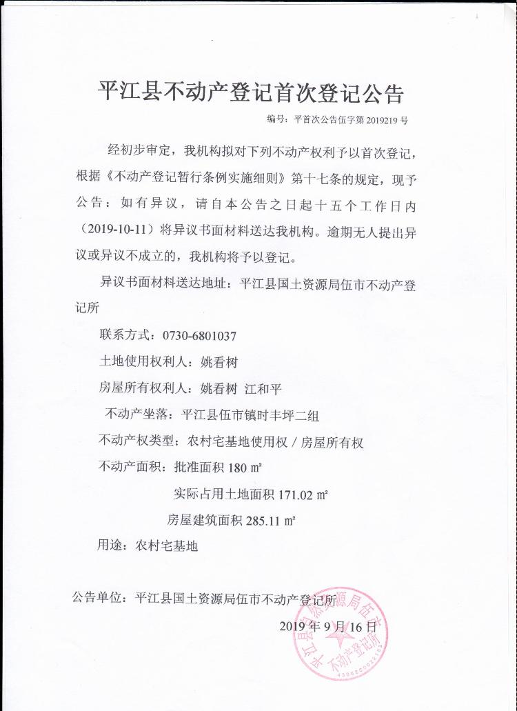 姚看树 江平和 平江县不动产首次登记公告 伍字第2019219号