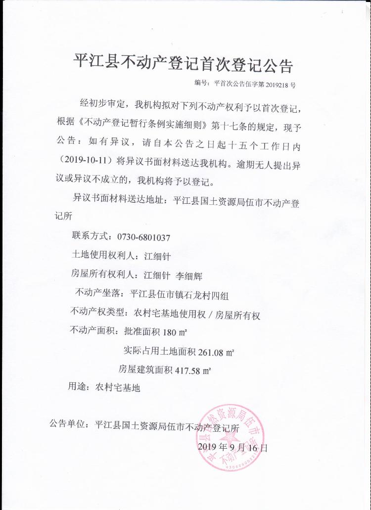 江细针 李细辉平江县不动产首次登记公告 伍字第2019218号
