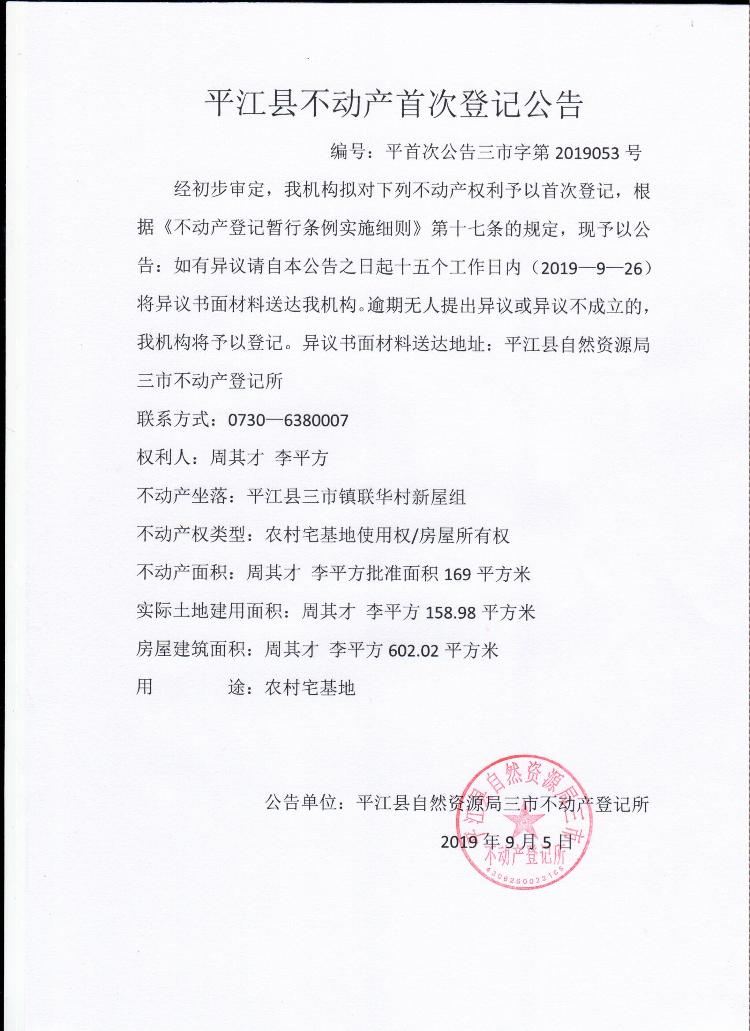 周其才 李平方平江县三市镇不动产首次登记公告
