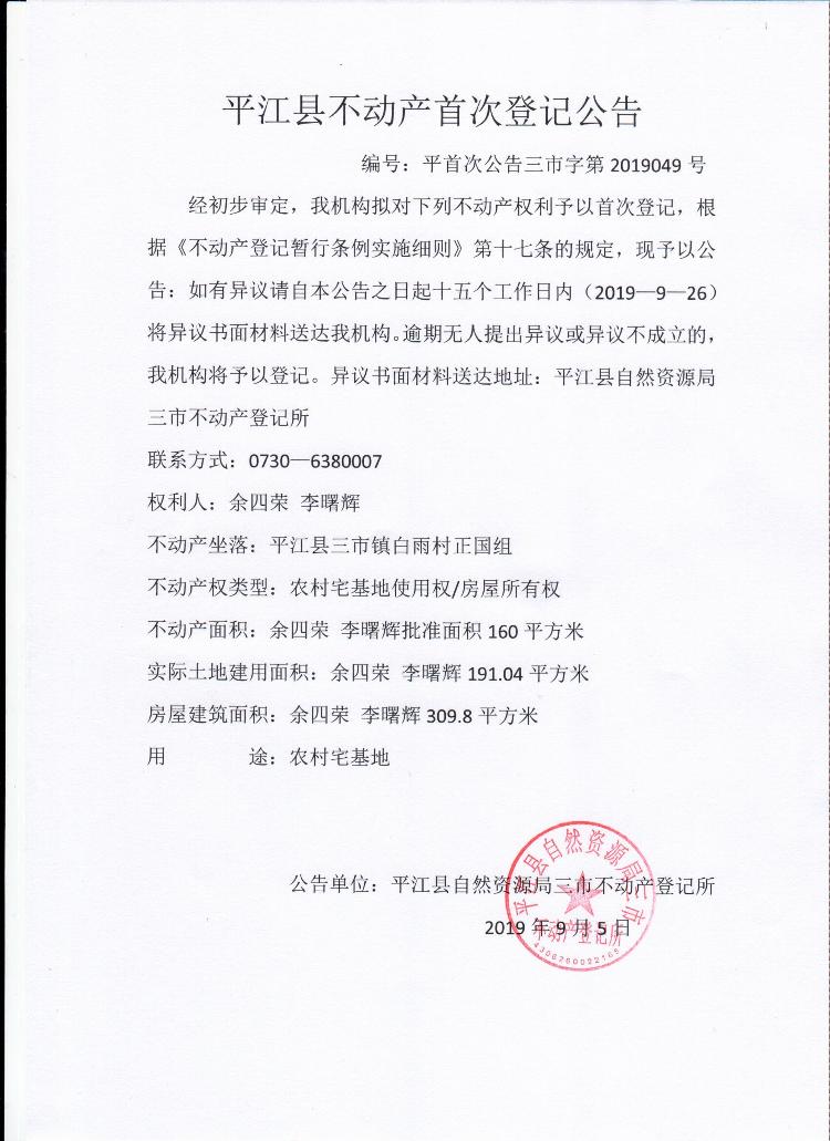 余四荣 李曙辉平江县三市镇不动产首次登记公告