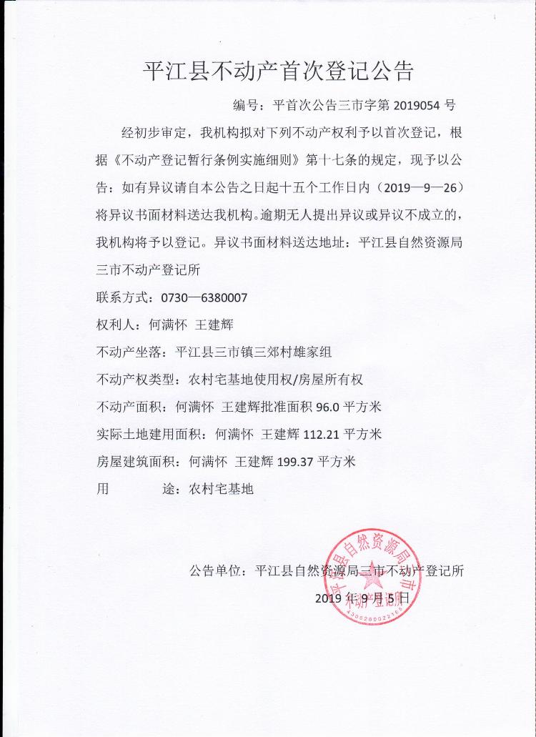 何满怀 王建辉平江县三市镇不动产首次登记公告
