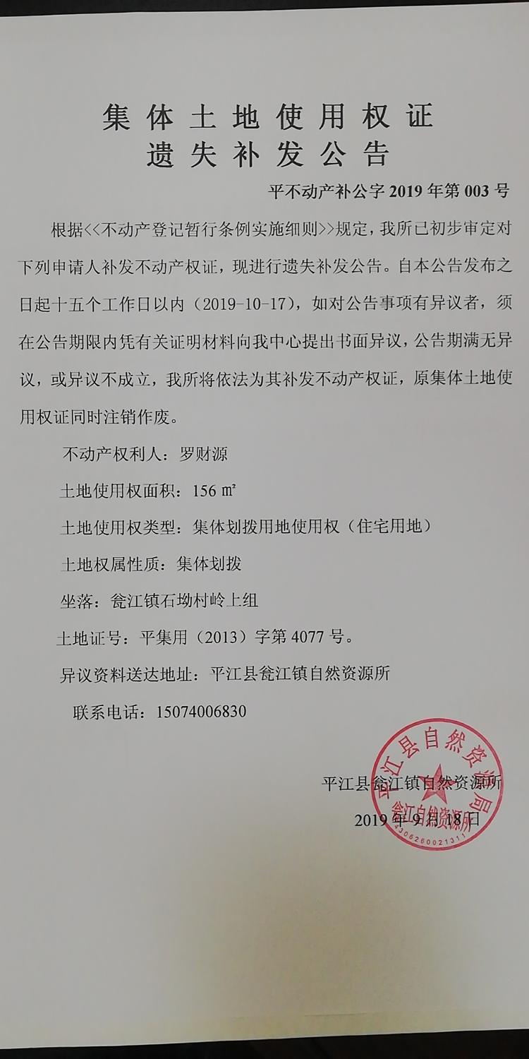 罗财源集体土地使用权证遗失补发公告