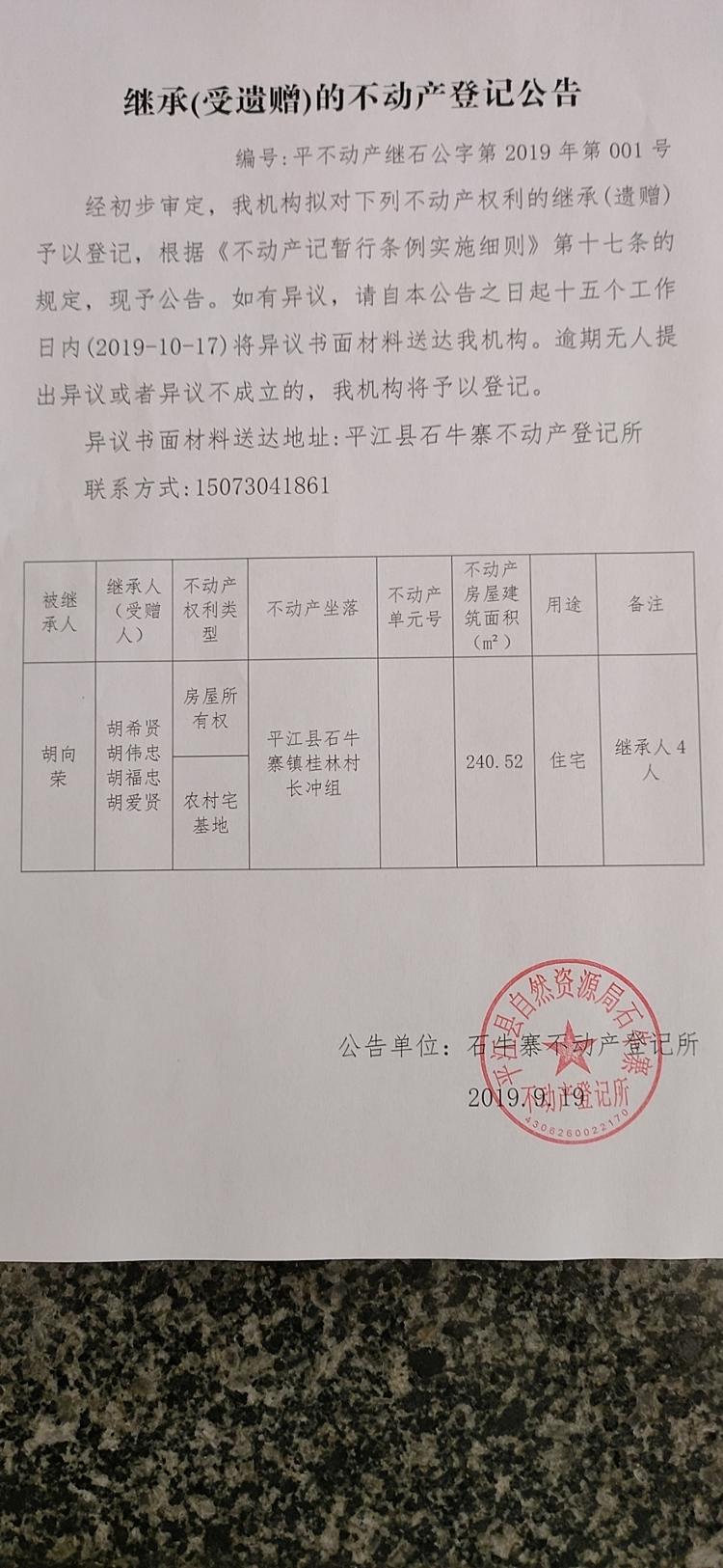 胡希贤 胡伟忠 胡福忠 胡爱贤继承(受遗赠)的不动产登记公告