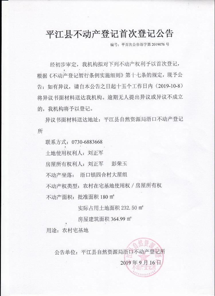 刘正军 彭荣玉平江县不动产首次登记公告