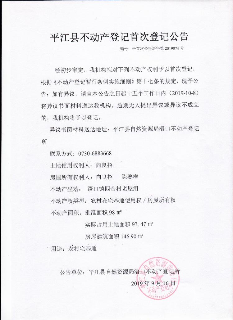 向良招 陈熟梅平江县不动产首次登记公告