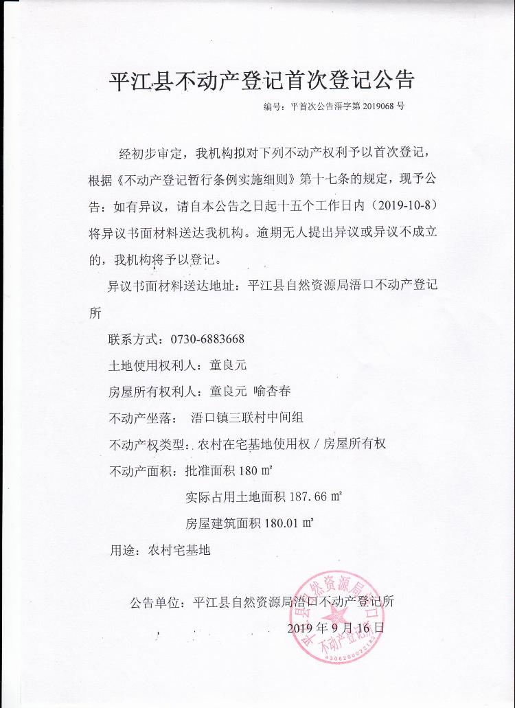 童良元 喻杏春平江县不动产首次登记公告.jpeg