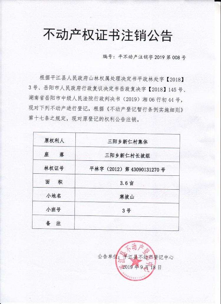 三阳乡新仁村不动产权证(林权证)注销公告