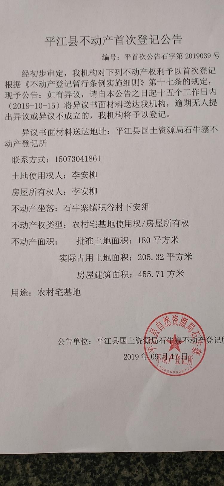 李安柳平江县不动产首次登记公告
