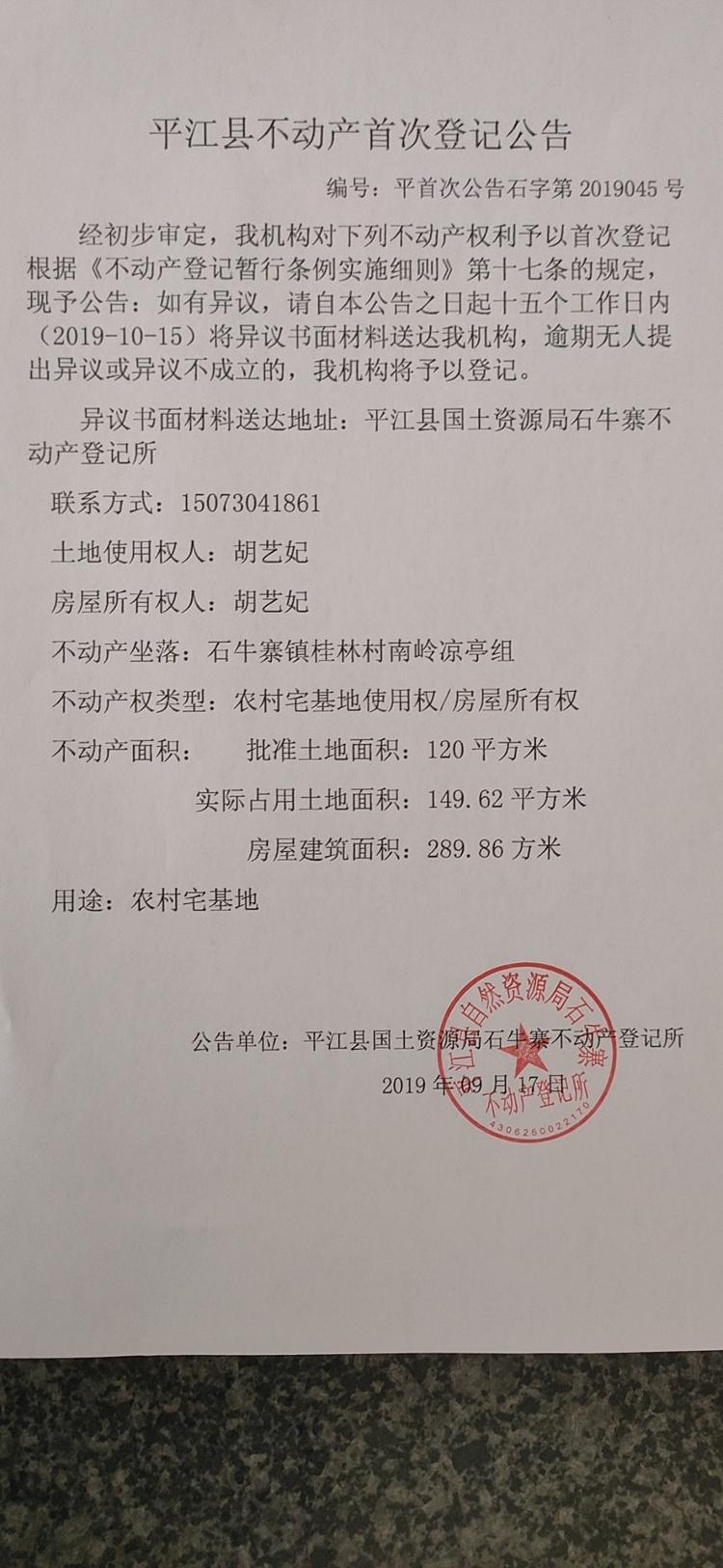 胡艺妃平江县不动产首次登记公告