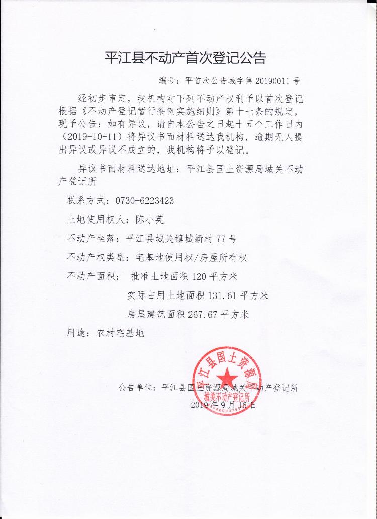 陈小英平江县不动产首次登记公告