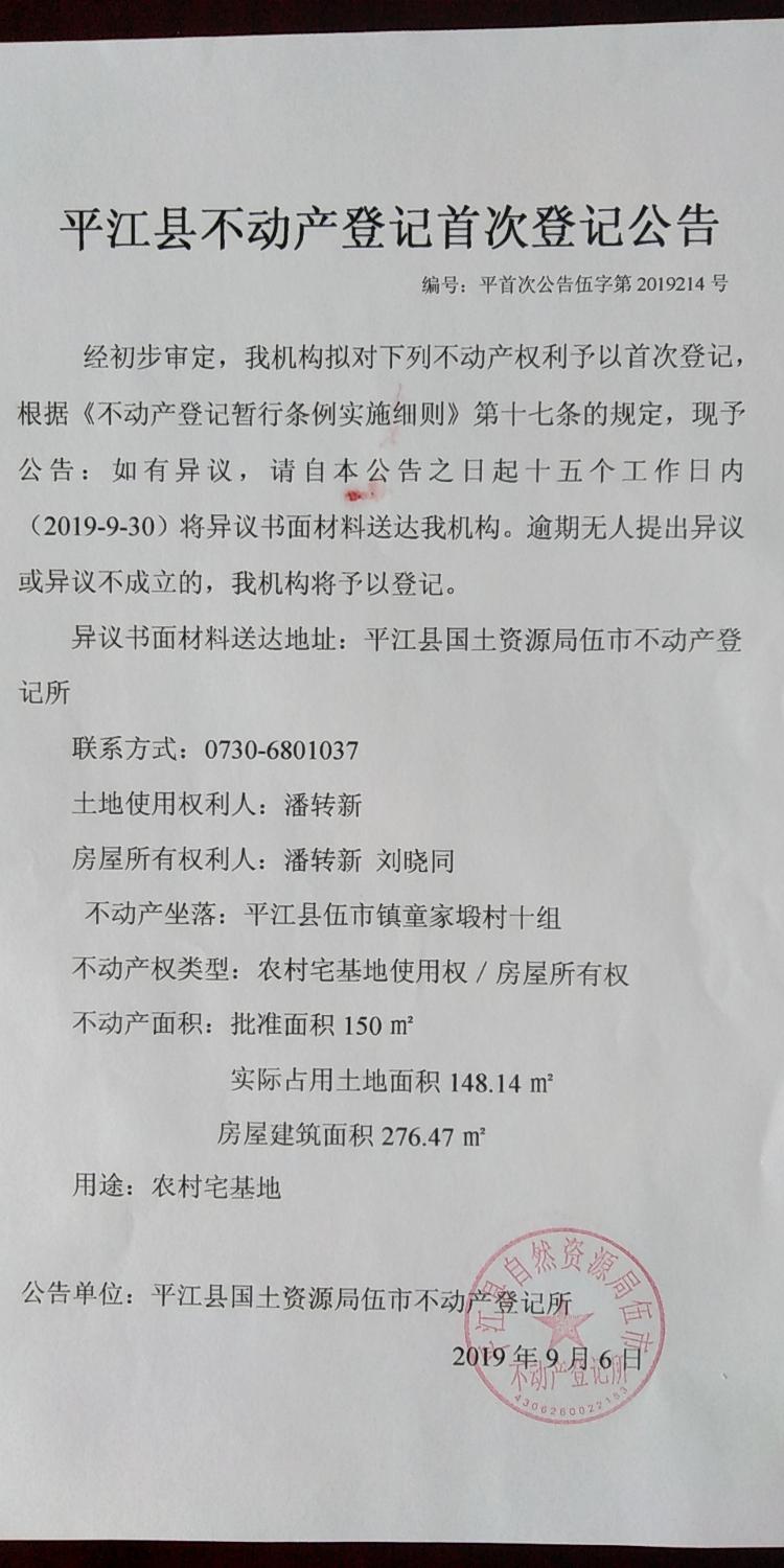 潘转新 刘晓同平江县不动产首次登记公告