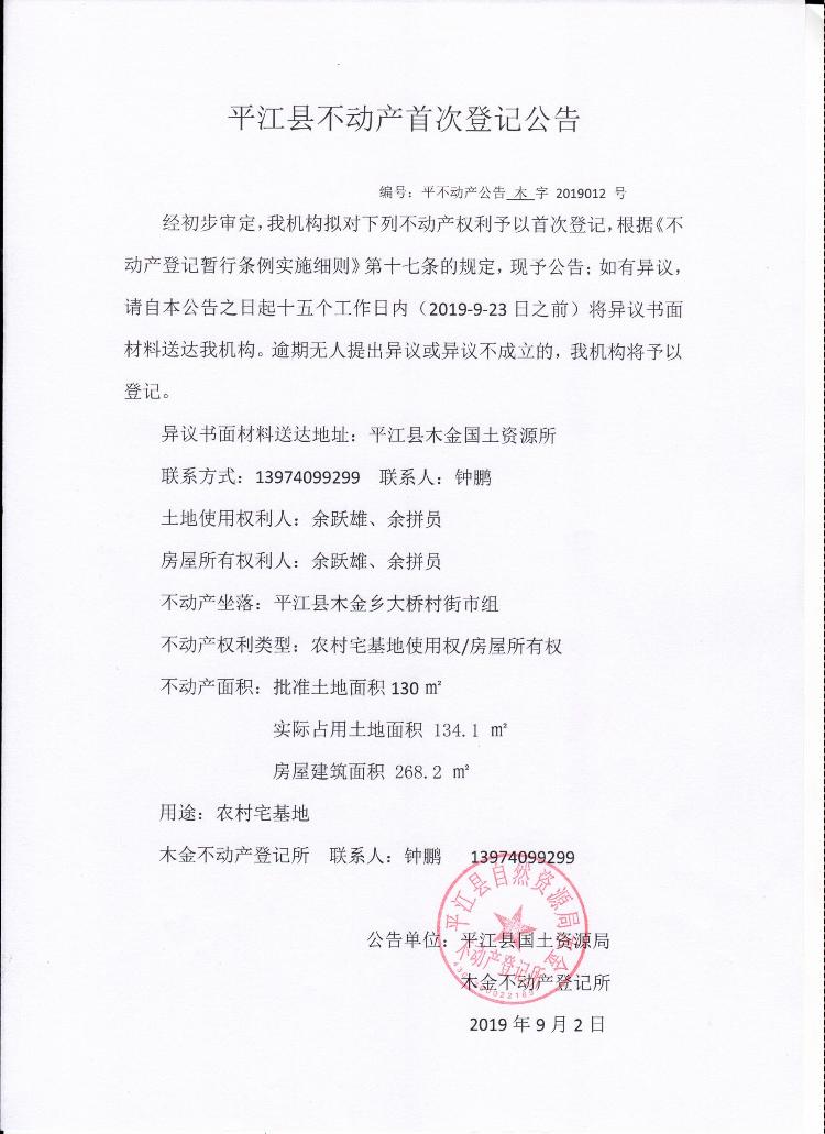 余跃雄 余拼员平江县不动产首次登记公告