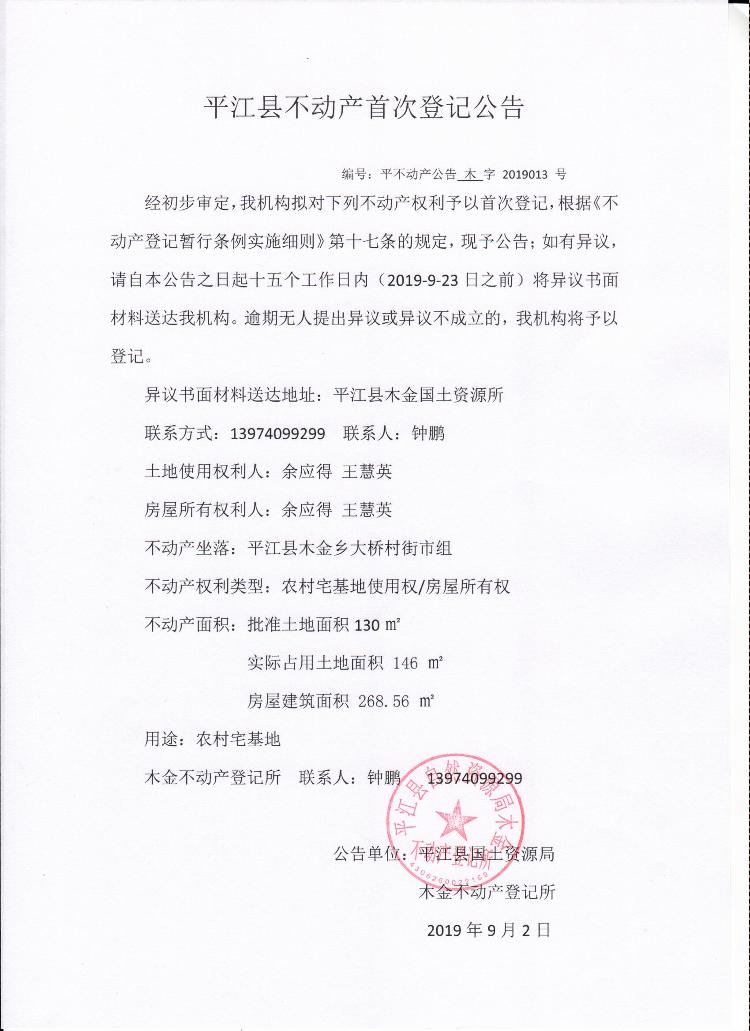 余应得 王慧英平江县不动产首次登记公告