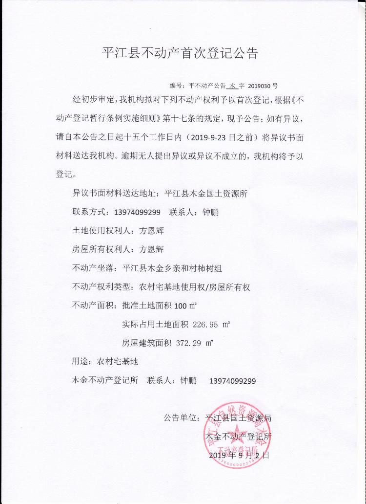 方恩辉平江县不动产首次登记公告