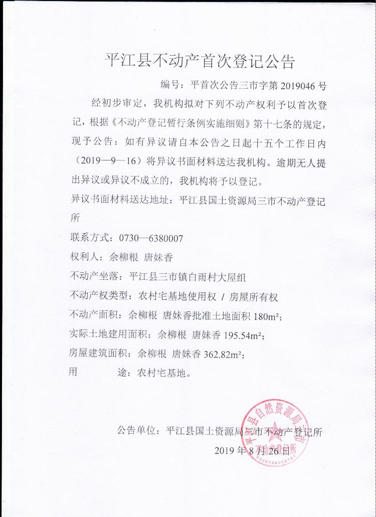 余柳根 唐妹香平江县不动产首次登记公告三市字第2019046号
