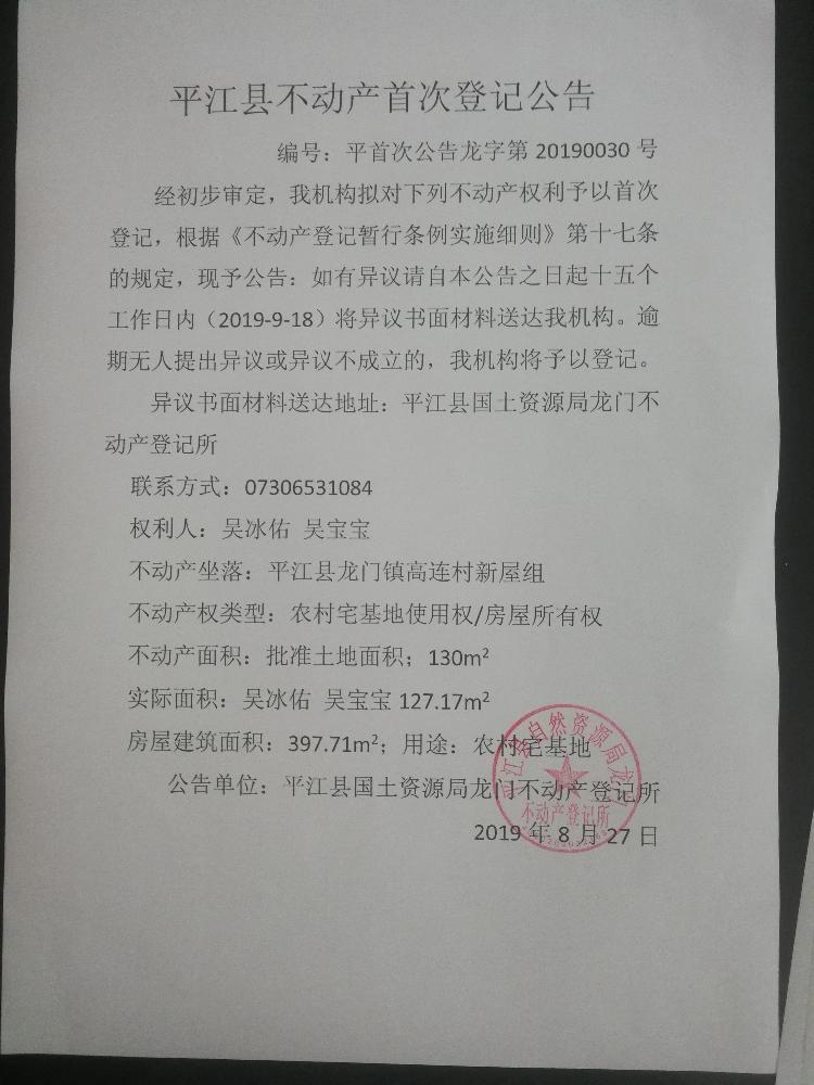 吴冰佑 吴宝宝平江县不动产首次登记公告