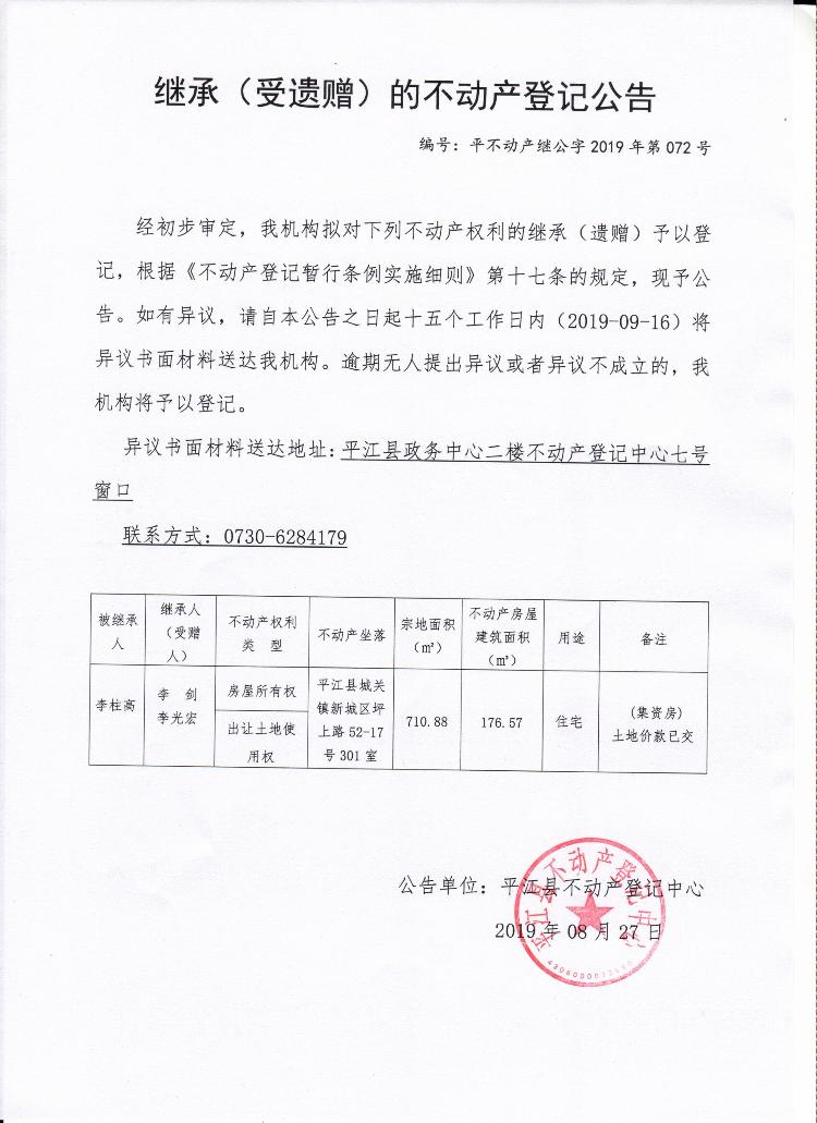 李剑 李光宏继承(受遗赠)的不动产登记公告