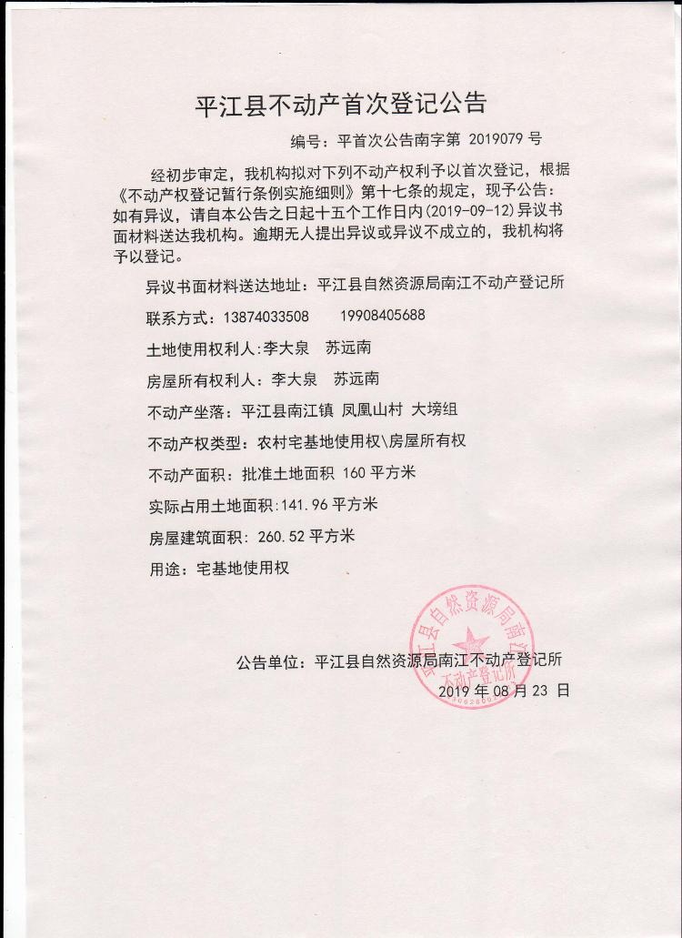 李大泉 苏远南平江县不动产首次登记公告