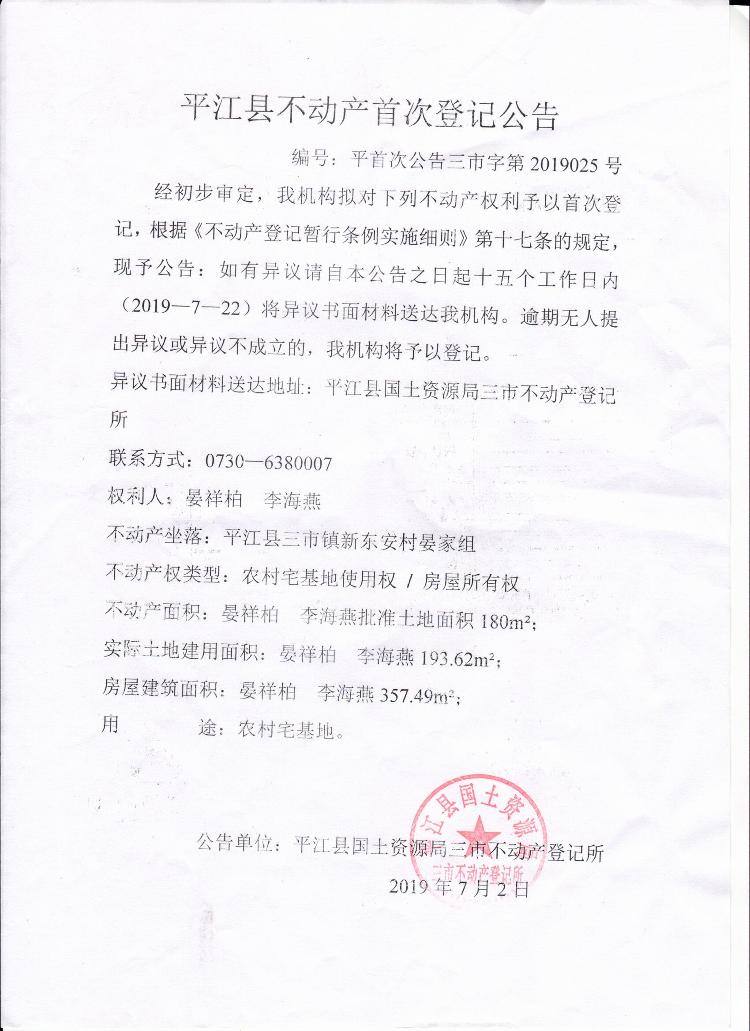 晏祥柏 李海燕平江县不动产首次登记公告三市字第2019025号