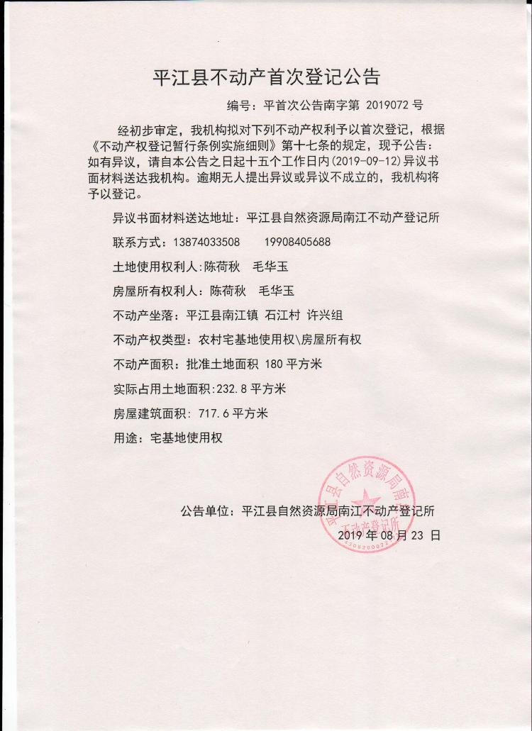 陈荷秋 毛华玉平江县不动产首次登记公告
