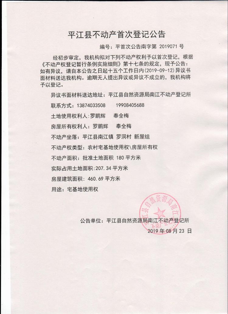 罗鹏辉 奉全梅平江县不动产首次登记公告