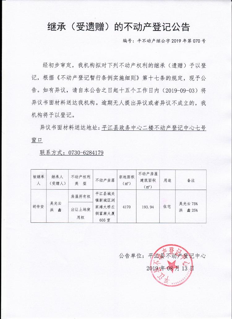 吴光云 洪鑫继承(受遗赠)的不动产登记公告